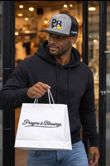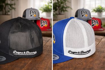 Designed in a heathered ash-gray front with a black mesh back, this snapback delivers a balanced blend of resilience and refinement. The raised PB embroidery is finished with a gold heart—symbolizing purpose, gratitude, and endurance—while the Prayers & Blessings script on the side serves as a subtle mark of intention.